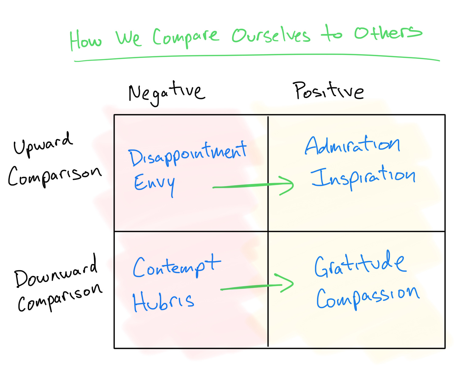 Crucially, there are positive and negative emotional effects within each type of comparison. We can feel emotions that compel us to detract or to enhance ourselves.
