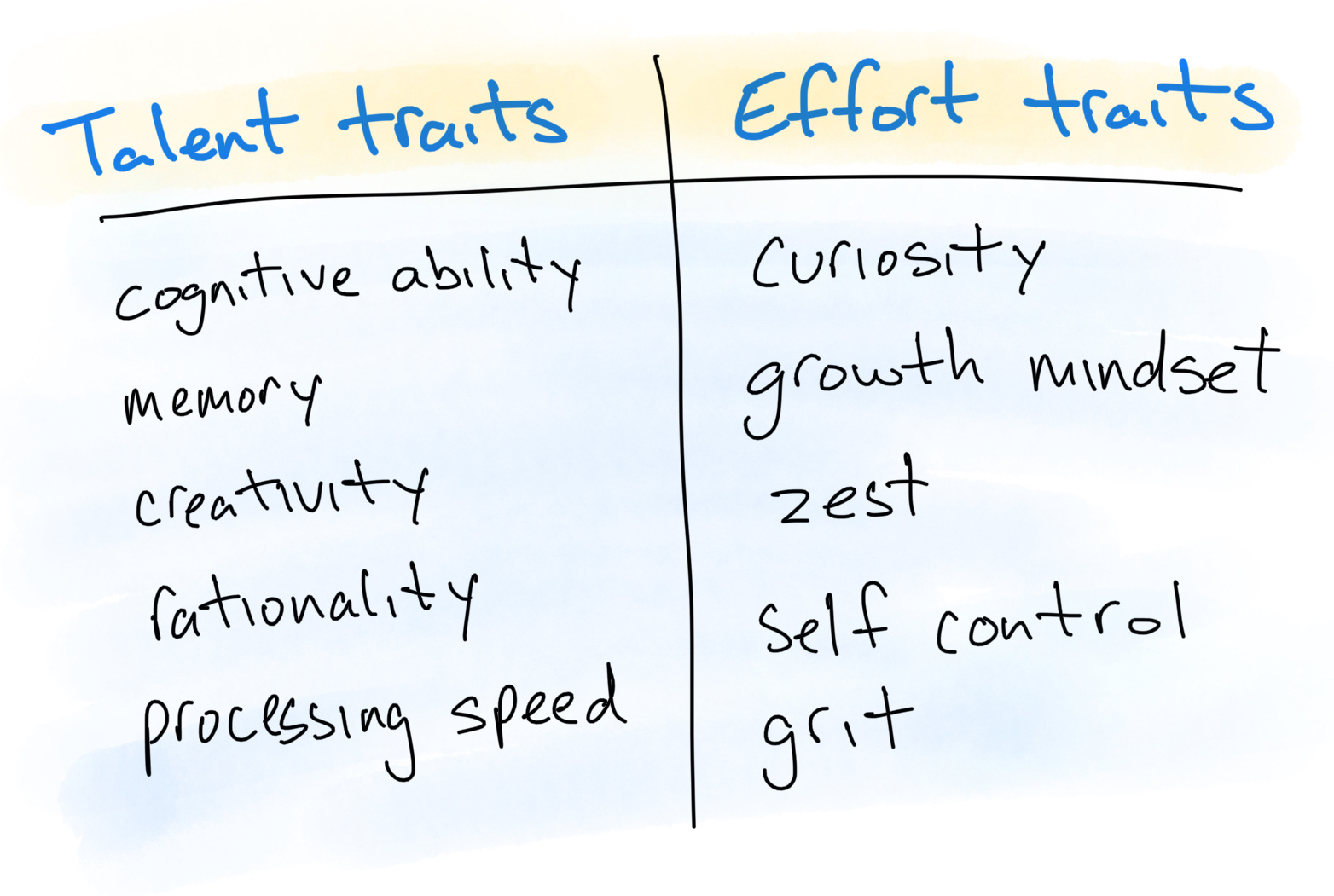 Talent is most associated with traits relating to how our brain processes the world – cognitive ability, creativity, intelligence. Effort is most associated with how we apply our brainpower – zest, self-control, curiosity. While we’re born with an innate set of traits, both talent and effort traits are malleable (a fascinating domain unto its own, not addressed here).