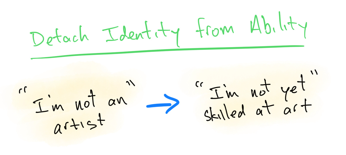 We tie our identities to our talents. Statements such as “I’m not an artist” or “I’m not a numbers person” harden our beliefs. However, if we detach our identity from our skills we change what’s possible. Our identity does not define our abilities. Rather, we choose our abilities. We move from “I’m not an artist” to “I’m not yet skilled at art.”